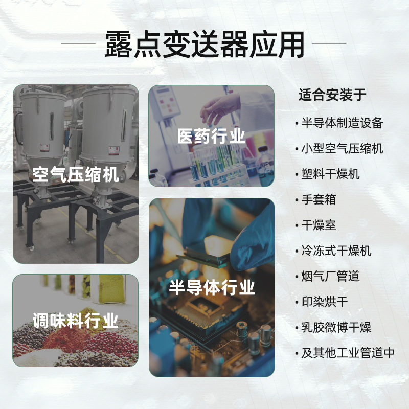 應(yīng)用領(lǐng)域 鋰電池生產(chǎn)、電子元器件制造、半導(dǎo)體制造、電力工程設(shè)備;可集成于干燥系統(tǒng)、壓縮空氣系統(tǒng)、恒溫恒濕系統(tǒng)等設(shè)備中,用于氣體潮氣檢測(cè)。